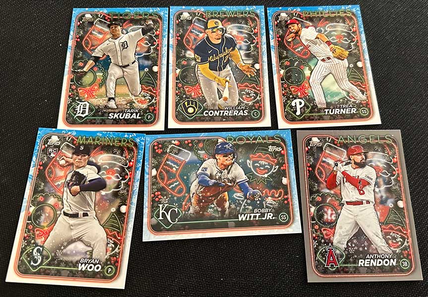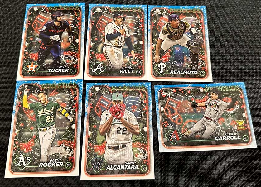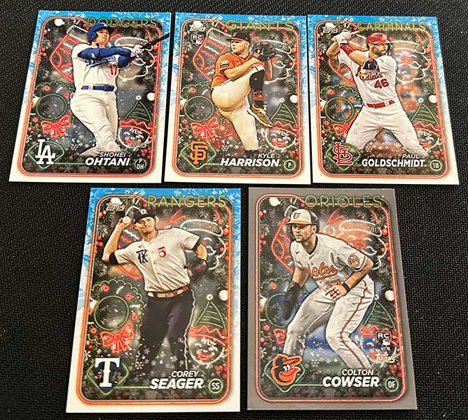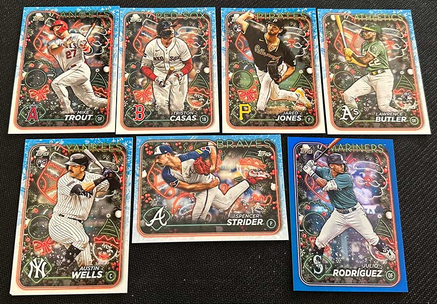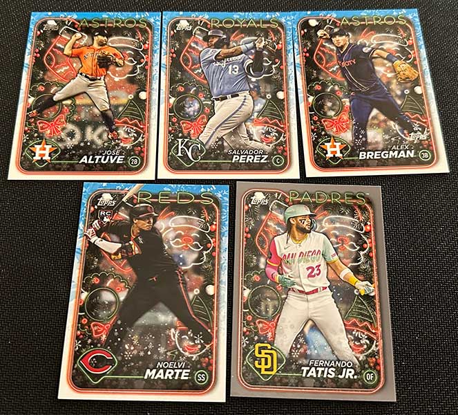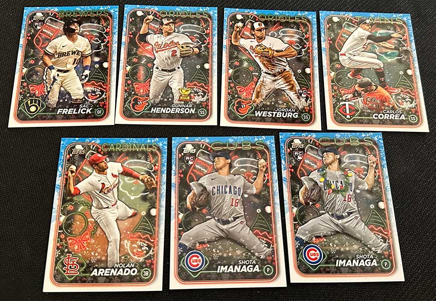 The Photo Variation cards make it a fun rip. Keep an eye out for players wearing Santa hats, Christmas light necklaces, using candy cane bats, among others.